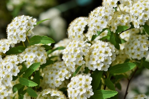 日当たりと風通しの良い場所で良く育ち、春には枝いっぱいに白い花を咲かせます。小さな花が丸く集まって咲く姿が、手毬のように見えることから、「小手毬(コデマリ)」と名づけられました。花後に剪定をして形を整えと、翌年も美しい花を楽しめます。