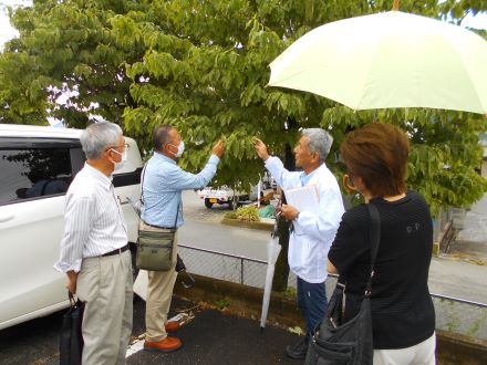 それでも座学が終わるころには、雨も小降りになったので屋外に出て、ハクレン・ムクゲ・アメリカハナミズキ等の樹木の前で、剪定について角田先生から説明を受けました。