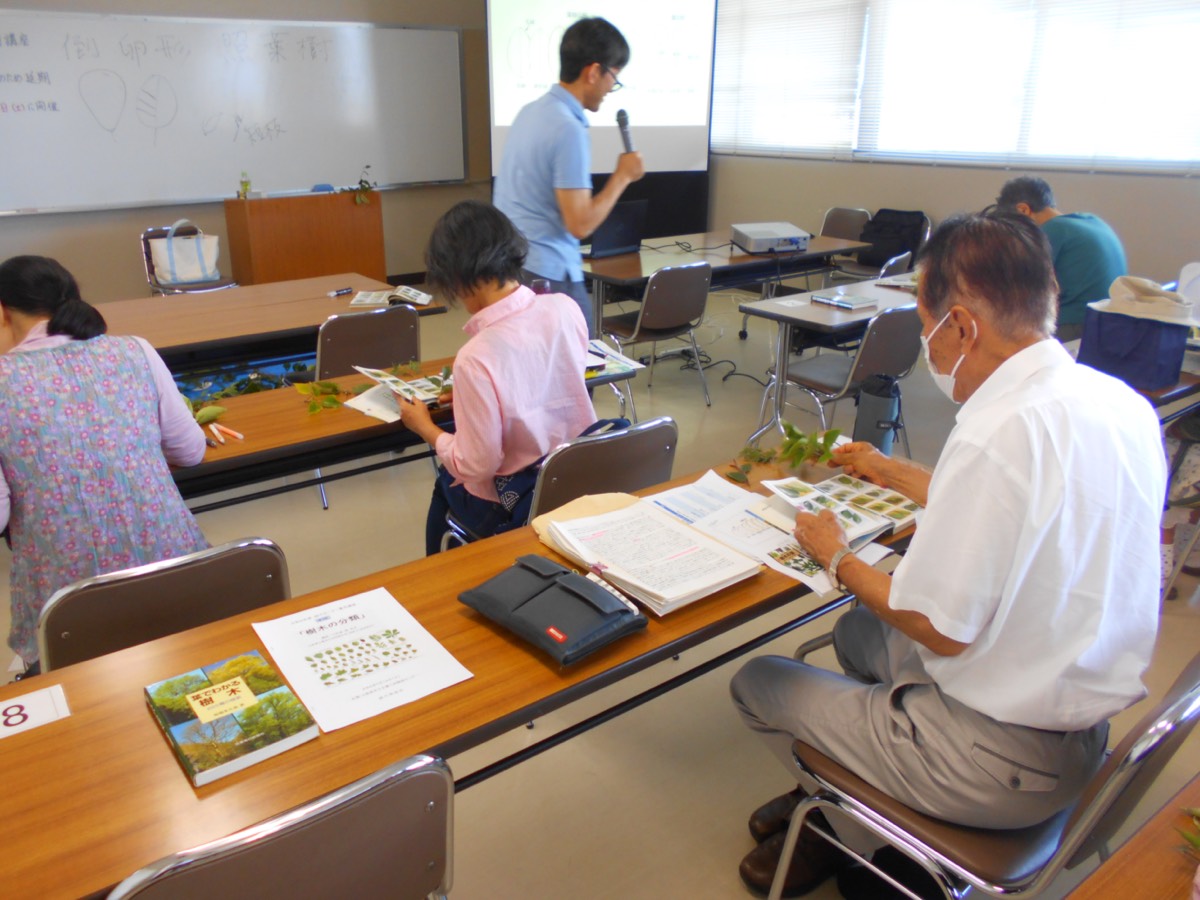 『葉でわかる樹木』(発行所:信濃毎日新聞社)をテキストとして使い、事前に採取しておいたブナやカクレミノ、ミズメ等の葉から樹木名を検索しました。