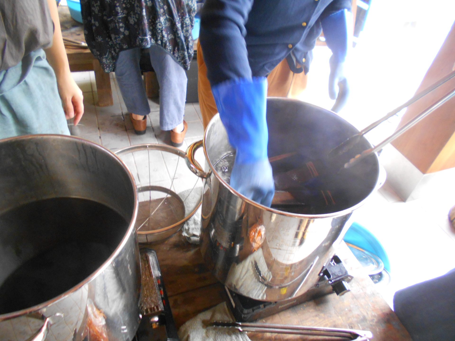 この日はバンダナと手拭いに、イガグリを使って草木染め!