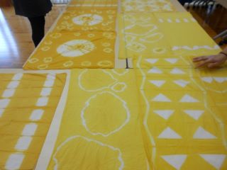 講師の末木美那先生は多摩美術大学卒業後、沖縄西表島の紅露工房で研修され、環境と共にある染色文化を学ばれた方です。この日はバンダナと手拭いに、タマネギの茶色の皮を使って草木染めを行ないました。