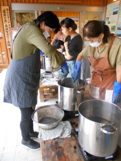 ❶玉ネギ(茶色の皮)を使い染液を作る(先生が作っておいてくれました)