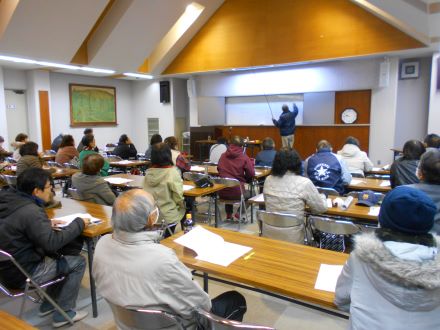 まず座学にて、久保田先生に自宅から持ってきていただいた、ビワ・モモ・スモモ・カキ・ナシの枝を使い、実のなる木の仕立て方や剪定のポイント、肥料や病虫害予防と対策等について学びました。