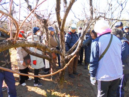 次に、屋外に出て農林高校の農場をお借りし、モモ・リンゴ・カキ・ウメ・ユズ・キウイ・ブドウ・サクランボの樹木をまわりながら説明を受け、先生が剪定するのを見ながら剪定の仕方を学びました。