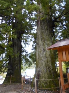 樹齢推定350年。夫婦杉は八幡日吉神社正面参道の両側に5mほど離れて立っています。
