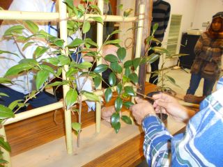 その他、竹垣の作り方として模型を使って、四ツ目垣の作り方や、シュロ縄でサザンカの枝を固定するなどの実習をしました。