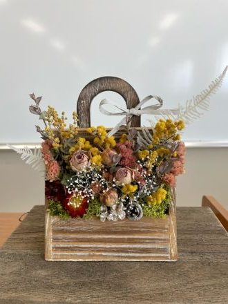 次に木製のカバン型の容器にドライフラワーをアレンジしました。