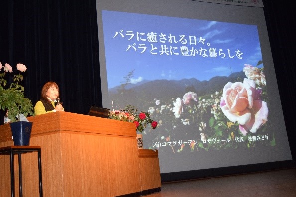 令和5年度特別講演会が、バラ苗専門店コマツガーデン(店舗ROSA・VERTE)代表で、ローズファーマーとして全国的にご活躍されている後藤みどり氏を迎え、11月17日(金)東京エレクトロン韮崎文化ホール小ホール(韮崎市)で開催されました。