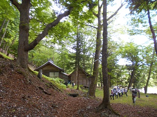 この神社一帯の山々は、石灰岩地であり大きな石灰岩が露出している所もあります。樹木としては、トチの大木数本、アサダの大木の他、スギ・プラタナス・イチョウ・ケヤキ・カツラ等も繁茂しており、植物群と合わせ、社叢林として貴重です。石灰岩特有のカタクリ・ヤマブキソウ・ワニグチソウ・イチリンソウ等の群落も見られ、落葉樹主体の明るい社です。