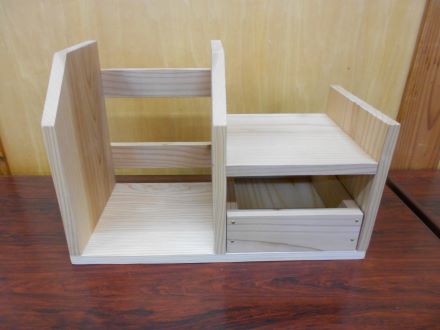 この日は、県産材のスギの木を使って、小物入れ付き本立てを作りました。