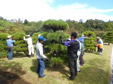 参加者を3班に分け、講師の小林稔蔵先生、緑の相談所角田信夫樹木医から、松の樹姿・樹勢を保つ剪定の仕方について指導を受けました。