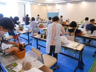 まずは秋山先生から、寄せ植えの基本(土作り・水やり・コンテナ・肥料・材料の選定)等について学び、実習に移りました。