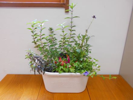 最初に講師の秋山先生から、寄せ植えの基本として土づくりや水やり、鉢・肥料・材料の選定・寄せ植えの配置等について学び、実習に入りました。今回寄せ植えに使用した苗は、ケイトウ、チョコレートコスモス、キンギョソウ、コムラサキ、トレニアコンカラー、以上5種類です。これらの苗を、お洒落な鉢に寄せ植えしました。鉢は白・黒・グリーンの中から好みに合わせて選んでもらいました。チョコレートコスモスやケイトウなど季節の花を使い、秋を感じる寄せ植えになりました。