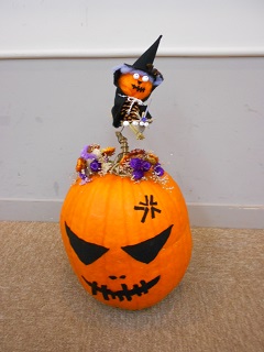 まず生のカボチャに、フェルトを切って、目・口等を貼り付けました。 次に羊毛フェルトなどでカボチャの上の人形を作りました。 最後に、ドライフラワー(カスミソウ・千日紅・スターチス等)でカボチャの上部を飾り、仕上げました。