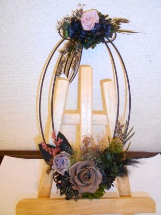 この日は「モダンウォールデコ」ということで、楕円形のお洒落なアイアンフレームに、バラ・アジサイ・カスミソウなどのプリザーブドフラワーやドライフラワーなどをアレンジしました。シックな仕上がりに皆さん大変満足されていました。