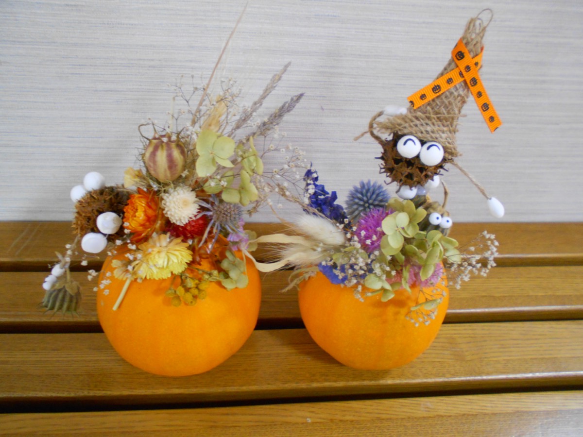 次に生のカボチャの柄の部分に、麦やアナベル、スターチスなどのドライフラワーを使って飾り付けをし、作品を仕上げました。