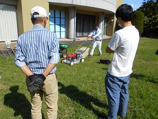 屋外実習では、ロータリー式芝刈り機、リール式芝刈り機、ローンスパイク、肩掛け式散粒機、刈払い機、エアレーション機材等、芝生の管理に必要かつ便利な機材・道具について実演を交え指導を受けました。
