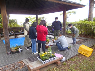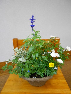 講師に、三越松花園経営の秋山智久先生を迎え「初夏を彩る寄せ植え」をしました。