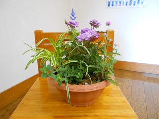 この日寄せ植えに使用した苗は、バラ(コルダナラベンダー)・センニチコウ(ネオンラベンダー)・アメリカンブルー・トレニア・ブルーサルビア・ヤブラン、以上6種です。 バラ(コルダナラベンダー)はドイツで育種されたミニ系の青バラで、四季咲き性が強く、適温さえあれば周年開花するようです。まだ5月ですが夏のような日差しの中での教室でした。