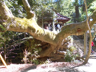 社殿の横手に2本の大ヒノキが立っている。樹高28m・/27m、目通り幹囲6.3m/4.6m、推定樹齢300年以上。「リョウメンヒノキ」というのは、ある種の奇形で、ヒノキを特徴づける葉裏の「Y」字模様が現れず、表裏両面とも同じようだということで名付けられたようです。(朝ドラの主人公牧野富太郎氏が名付け親)人工林の優等生たちと比べると、大ヒノキの規格外の力強さは痛快である。
