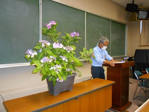 まずは座学で、角田先生から「花芽の形成・剪定の仕方・土・肥料・増やし方・ガクアジサイとヤマアジサイの見分け方・挿し木の適期等」について学び・・・
