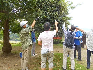 次に参加者を2斑に分け、屋外のキンモクセイ・カエデ等の樹木を使い、野尻先生と、緑の相談所樹木医の角田信夫先生から指導を受けながら実習しました。