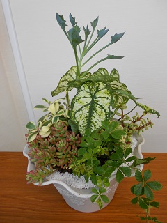 次に実習として、観葉植物シュガーバインとカラジュウム、マサイのヤジリ他、 多肉植物4種の寄せ植えをおこないました。 ボリューム感のある素敵な寄せ植えになりました。