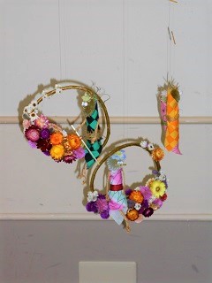 今回は、森の恵み(ドライフラワー、ツル等)を使い、今流行の鬼滅の刃バージョンでモビールを作りました。