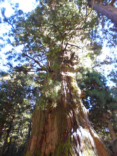 推定樹齢350年。夫婦杉は正面参道の両側に5mほど離れて向かい合っていて、その下を人が通るため、過去に下枝が整理されたようです。