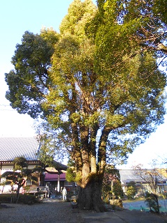 樹高21m、目通り幹囲5.1m、推定樹齢150年。参道の石段を上ると、隣接する日蓮宗永久寺との境界付近にクスノキが立っています。