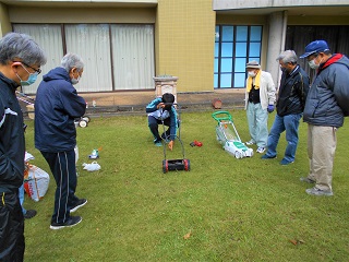 屋外実習では、エアレーションで使用するローンスパイク、エッジ切りに使用するターフカッター、芝刈りに使用するリールモア、電動バリカン等、芝生の管理に必要な機材・道具について実演を交え指導を受けました。