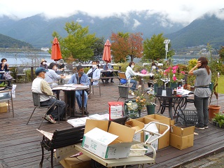 秋の河口湖を背にした研修会、最高のロケーションでした。