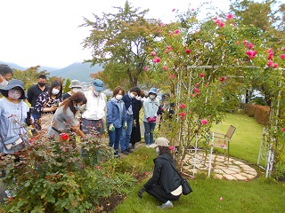 次に施設内の庭をお借りし、土づくり・四季咲きバラの剪定の仕方・ミニバラの剪定等を、参加者全員が
