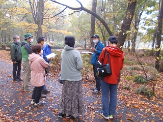 紅葉で色づく園内を散策しながら、アカシデ・ヤマブキ・ミツバツツジ・トウカエデ・ソヨゴ・テーダマツ・ニシキギなど19種類の樹木を中心に観察しました。