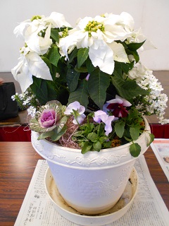 クリスマス向けの寄せ植えとして、プリンセチア(赤・白・ピンクから1色選んでもらいました)・パンジー(2ポット)・葉牡丹・サントリーナ・宿根イベリス以上5種の寄せ植えをしました。とても大きなプリンセチアを使い、豪華絢爛な仕上がりとなりました。(参加者大満足!!)