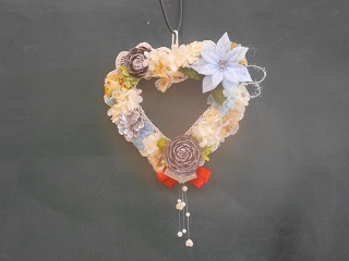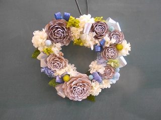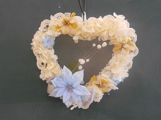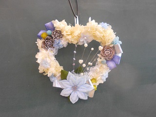 ハート型のベースに、あじさいのプリザーブドフラワーや松ぼっくり等を飾り、ホワイトリースを作りました。 完成品は参加者個々のオリジナルで素敵なリースに仕上がりました。