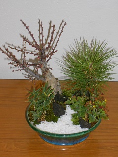 正月向けの寄せ植えとして、クロマツ・笹・梅(大盃)・寒菊を使い「松竹梅盆栽」を作りました。 鉢は雨宮先生がこの日のために焼いてくださったものを使いました。 最後に溶岩・寒水砂(白砂)・苔で川模様を表現し、古風で素敵な仕上がりとなりました。