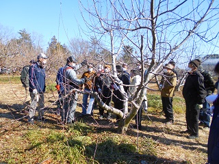次に、屋外に出て農林高校の農場をお借りし、モモ・リンゴ・カキ・ウメ・イチジク・サクランボ・ブドウ等の樹木をまわりながら説明を受け、参加者も剪定バサミを持ち、剪定実習を行いました。