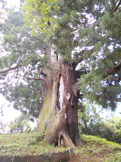 樹高40m、幹周8.3m、推定樹齢300年。花鳥山は、日本武尊の伝説があり古戦場の跡地です。大杉は遺跡の近く、緩やかな斜面の端に立っています。名は一本杉ですが、2本の融合木と思われます。大杉からは甲府盆地が良く見え、リニアの見える丘として有名になりました。