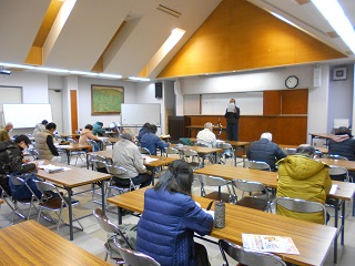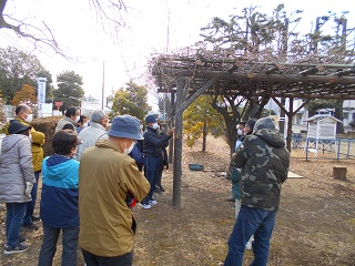 休憩をはさみ屋外に出て、フジ・ハナミズキ・キンモクセイ・サザンカ・ツバキ・マンサク等の樹木の前で、剪定方法について指導を受けました。