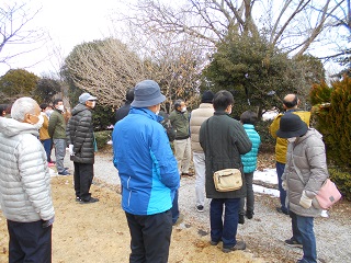 次に、屋外に出て庭園を回りながら、切るべき枝、残すべき枝、樹姿や樹勢を保つ剪定の仕方等について指導を受けました。