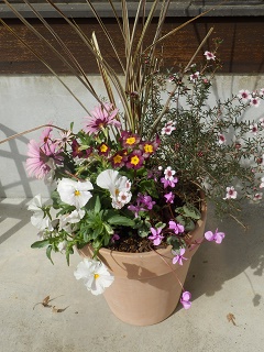 コウルジリネ、ギョリュウバイ、シクラメンコウム、パンジー、オステオスペルマム、プリムラ以上6種を使用しました。