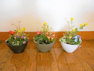 次に、屋外に出て寄せ植えをしました。 【使用苗】コロニラ・ビオラ・エリカ(エンジェルブリーズ)・アークトチス・忘れな草