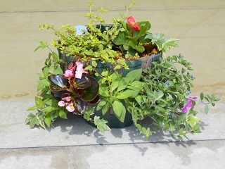 使った苗は、ペチュニア(3ポット)・ベゴニア(2ポット)・アメリカンブルー・トレニア・ヘデラ以上5種8ポットです。