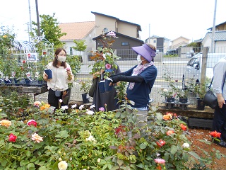 座学で、土・肥料・剪定・病気・消毒等について学びました。 屋外に出て、先生からバラの種類や特徴について説明を受けながら、参加者に好きな苗を選んでもらい植え替えを行いました。