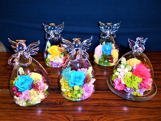 ガラス製ドームの中に、プリザーブドフラワーやソラフラワーを使いアレンジメントしました。