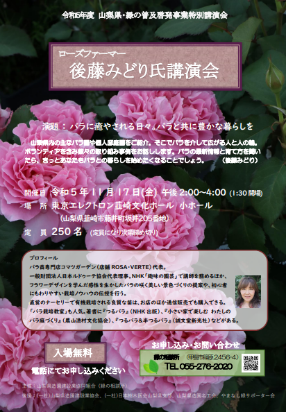 山梨県内の主なバラ園や個人邸庭園を紹介していただき、そこでバラを介して広がるボランティアをはじめとした人と人の輪などについて、数々の取り組み事例をお話ししていただきます。バラの最新情報と育て方を聞いたら、きっとあなたもバラとの暮らしを始めたくなることでしょう。
