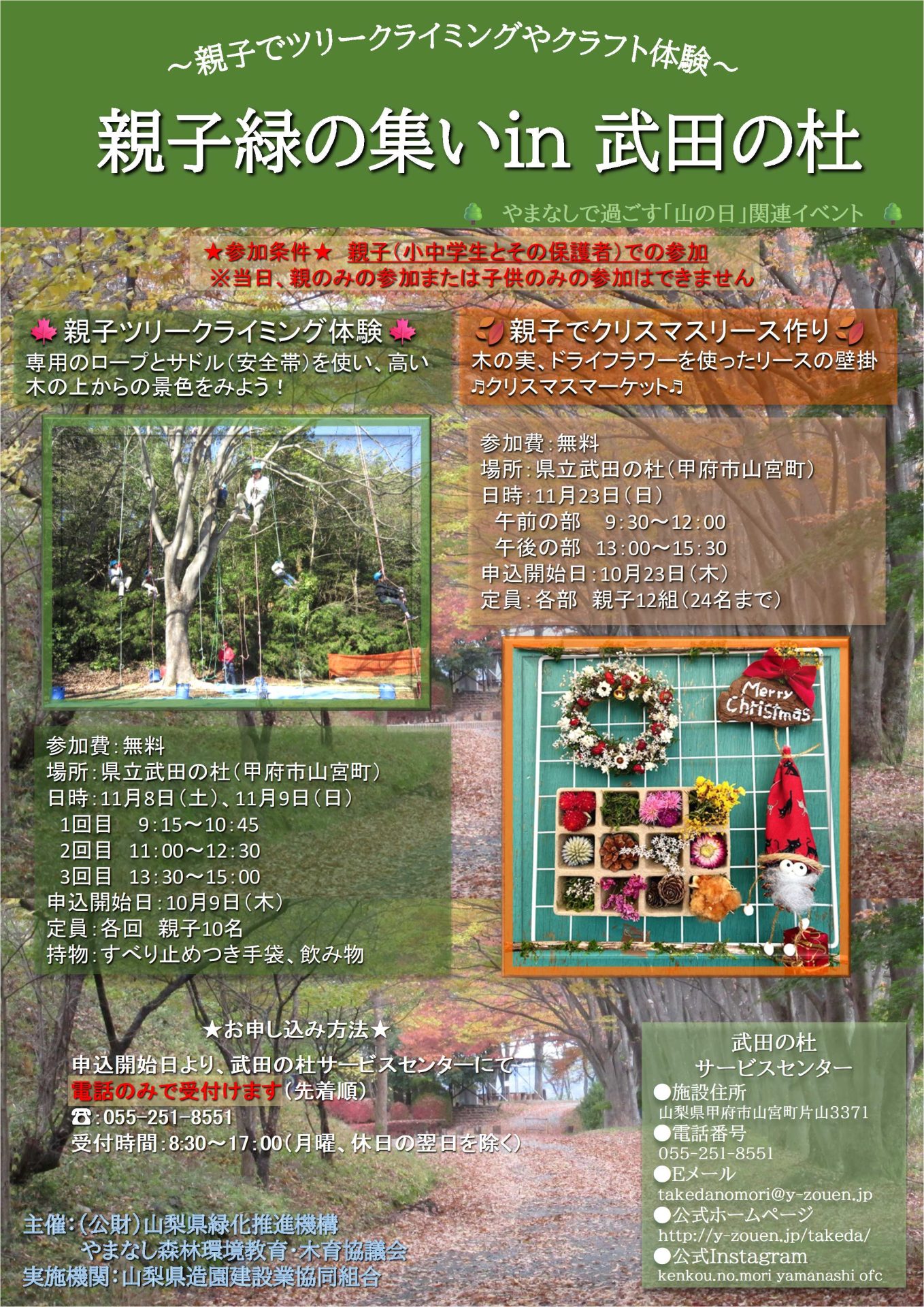 11月8日(土)9日(日)「親子ツリークライミング体験」~親子緑の集い~10/9(木)申込開始(電話にて)