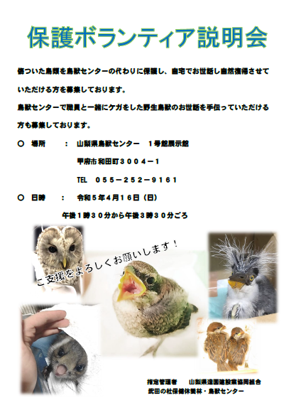4月16日(日)に鳥獣センターにて、「保護ボランティア説明会」を開催します。