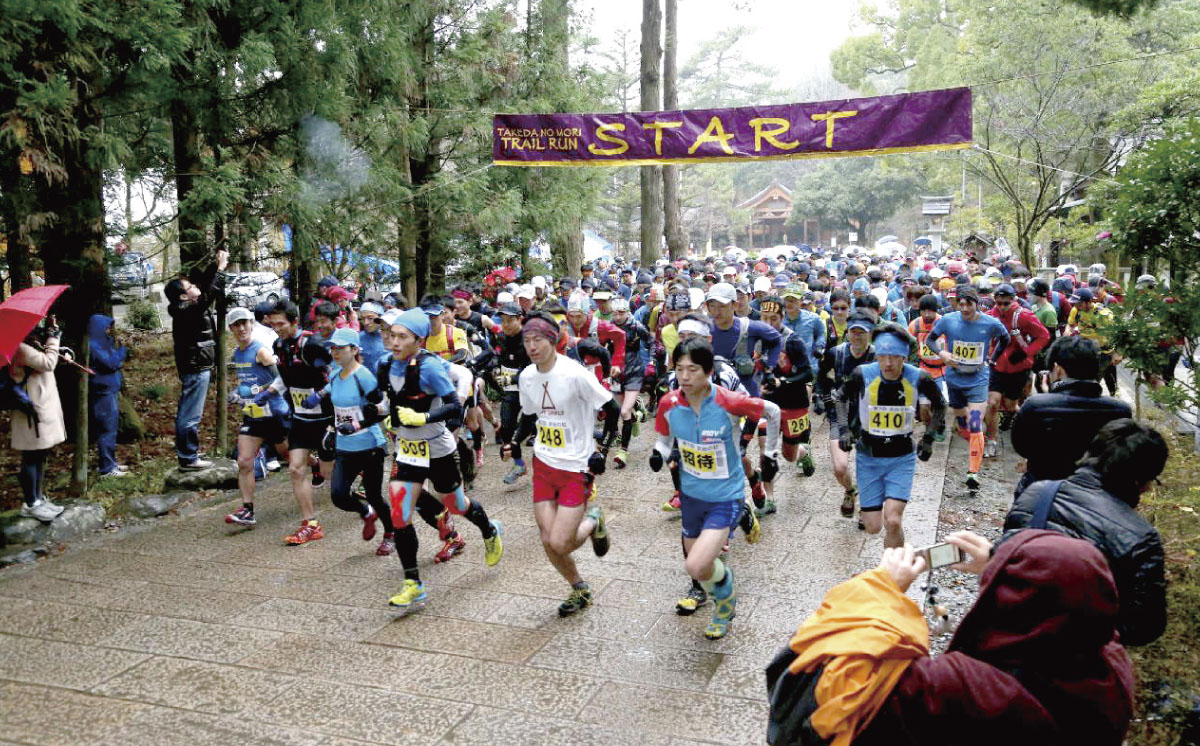 山梨県甲府の裏山ともいえる武田の杜は地元のトレイルランナー達にとって気持ちよく走れる人気のフィールドとなりました。高速道路のインターからも近く都心からもアクセスが便利で誰にでも気軽にトレイルランニングを楽しむことができる場所です。レースのコースはかつて武田城下町が栄えた戦国時代の名残でもある武田神社をスタートします。朝、参加選手達は神社でのご祈祷を受け、武田の杜のトレイルを駆け抜け30km先のゴールを目指します。